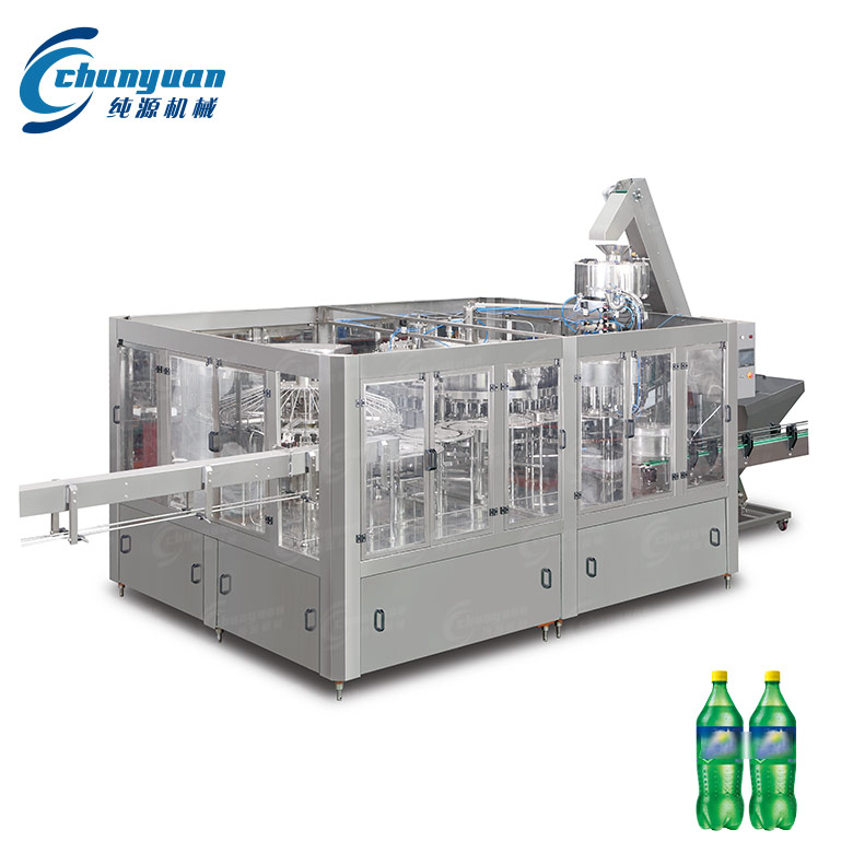 純源機械廠家供應的雪碧含汽飲料機械集沖洗、灌裝、旋蓋于一體,適用于灌裝雪碧、可樂、碳酸飲料、含汽蘇打水等含汽飲料的聚酯瓶灌裝,全過程實現(xiàn)自動化。