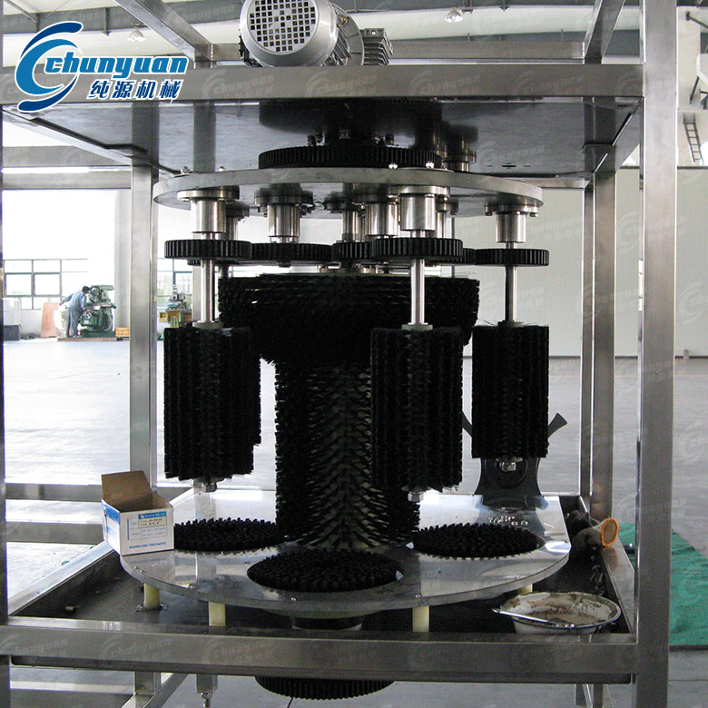 全自動外刷桶機由不銹鋼機架、封板(不銹鋼〉、主旋轉(zhuǎn)毛刷、毛刷調(diào)速電機、撥輪調(diào)速電機、捅底部旋轉(zhuǎn)毛刷、撥輪結(jié)構(gòu)、 沖洗水泵、噴淋室等組成。全自動外刷桶機采用優(yōu)質(zhì)不銹鋼制作,耐腐蝕,易清洗。主要氣路原件均采用臺灣亞德克產(chǎn)品,該機結(jié)構(gòu)緊湊, 工作效率高且穩(wěn)定可靠,自動化程度高,操作簡單。