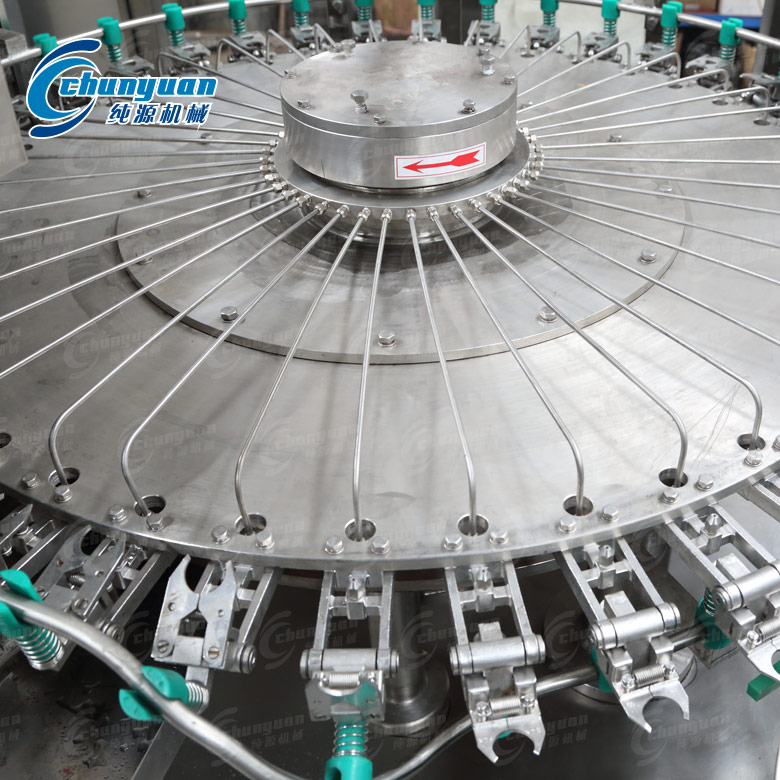 PET瓶由分瓶星輪進(jìn)入設(shè)備由夾鉗和翻轉(zhuǎn)機構(gòu)夾住瓶口轉(zhuǎn)至瓶口朝下,無菌水沖洗后瀝干,自動翻轉(zhuǎn)至瓶口朝上,經(jīng)出瓶星輪輸送至灌裝機。設(shè)備主要結(jié)構(gòu)與沖洗介質(zhì)接觸部分和外部防護(hù)罩均為優(yōu)質(zhì)不銹鋼材料;開放式齒輪傳動。