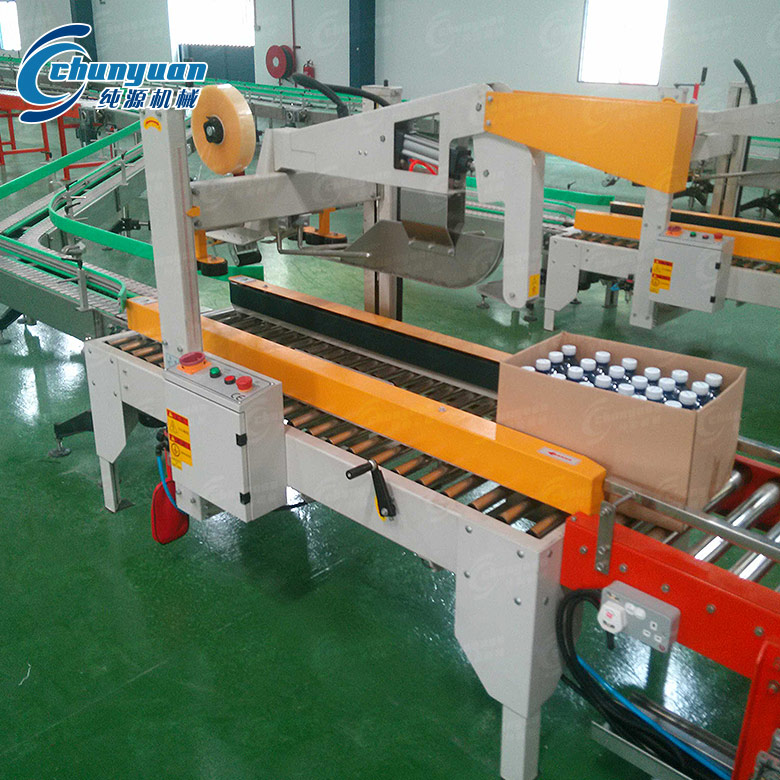 全自動折蓋封箱機紙箱上蓋自動折入,平穩(wěn)順暢,封箱作業(yè)一氣呵成,美觀省力,可配合自動化包裝機械系列使用;新型貼帶器,不用鼓風機吹挺膠帶,利用壓片裝置,使膠帶挺立不彎下而造成不能粘貼;上下皮帶傳動,主傳動機構(gòu)使用特殊培林座高精密、低噪音,增加皮帶使用壽命。